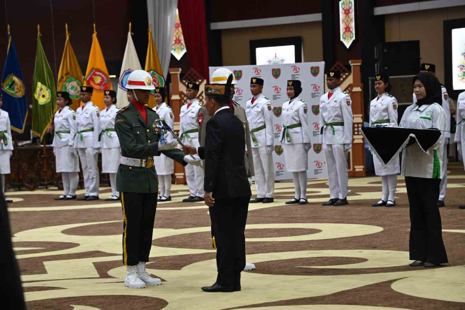 PALANGKA RAYA,katakata.co.id- Gubernur Kalteng, Agustiar Sabran bertindak selaku pembina upacara dalam Pengukuhan Pasukan Pengibar Bendera Pusaka (Paskibraka) Provinsi Kalimantan Tengah, di Aula Jayang Tingang, Jumat (15/8/2025).