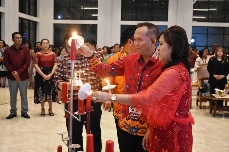 Kapuas Septedy saat menyalakan lilin acara ibadah dan perayaan natal Kerukunan Warga Kristiani Kesehatan (KWKK) Kabupaten Kapuas di Aula Rujab Bupati, Sabtu (6/01/2024) sore. (foto: ist)