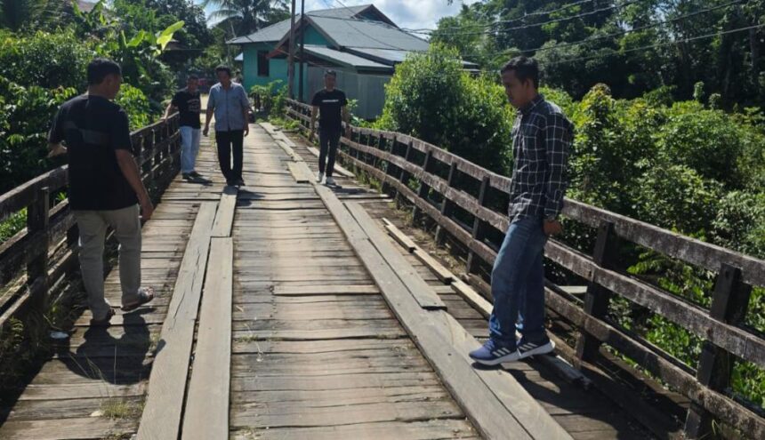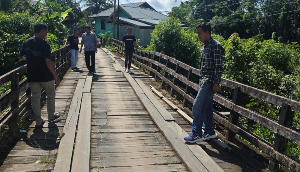 PENINJAUAN: Anggota DPRD Mura, Akhirudin saat meninjau Jembatan di Desa Muara Untu