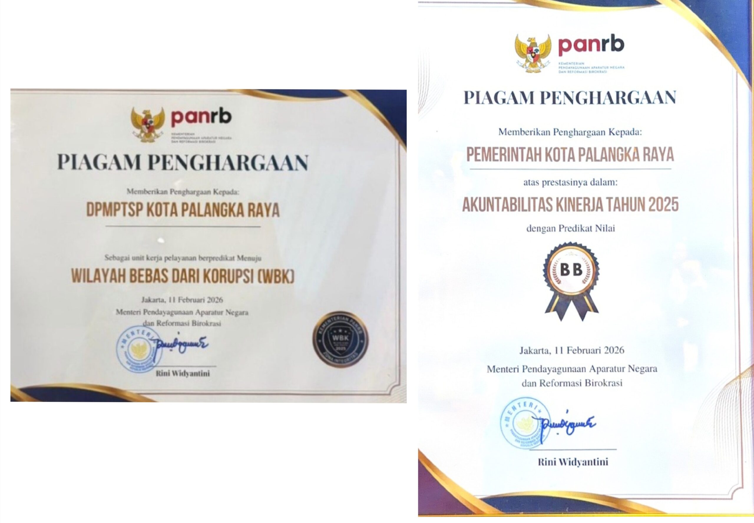 JAKARTA,katakata.co.id– Pemerintah Kota Palangka Raya kembali menorehkan prestasi di tingkat nasional dengan meraih predikat BB (Sangat Baik) dalam Evaluasi Sistem Akuntabilitas Kinerja Instansi Pemerintah (SAKIP) Tahun 2025. Selain itu, Dinas Penanaman Modal dan Pelayanan Terpadu Satu Pintu (DPMPTSP) Kota Palangka Raya juga berhasil meraih penghargaan Zona Integritas menuju Wilayah Bebas dari Korupsi (WBK).