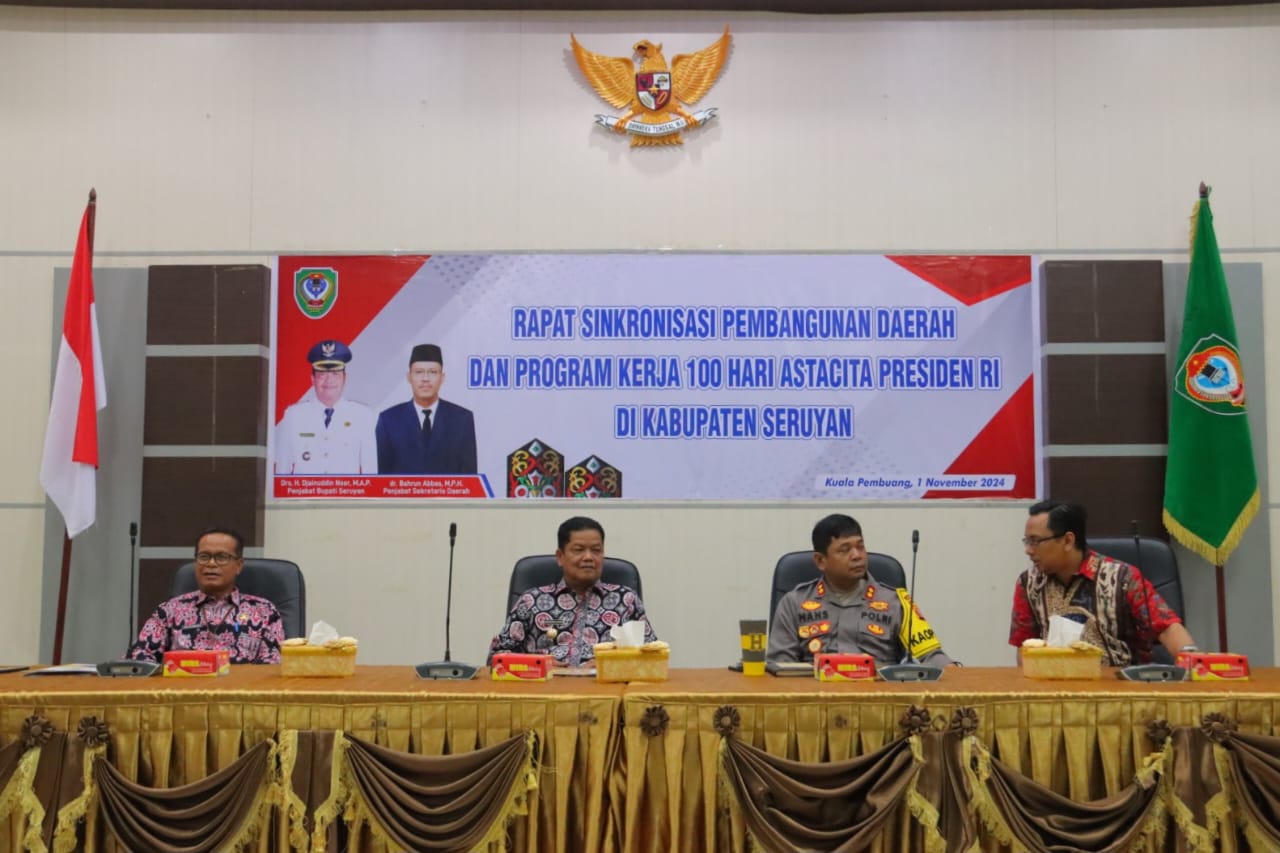 Terkait hal tersebut, Pemerintah Daerah Kabupaten Seruyan melaksanakan rapat Sinkronisasi Pembangunan Daerah dan Program Kerja 100 Hari Asta Cita Presiden dan Wakil Presiden Republik Indonesia (RI) yang dipimpin Penjabat (Pj) Bupati Seruyan, Djainuddin Noor dan dihadiri Kapolres Seruyan, Kasi Pidana Khusus (Pidsus) Kejaksaan Negeri Seruyan dan Kepala Perangkat Daerah di Lingkungan Pemerintah Kabupaten Seruyan.