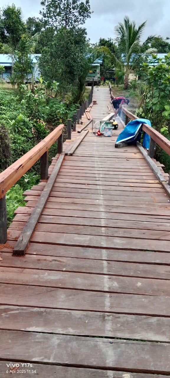 Jembatan Desa Tumbang Mahop didirikan bangunannya dari material kayu menggunakan dana desa setempat.
