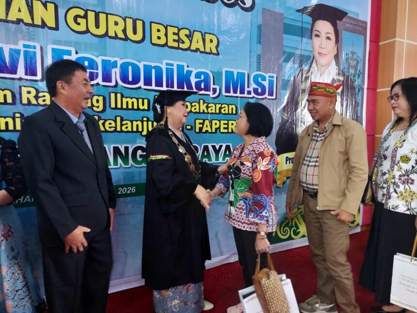 PALANGKA RAYA, katakata.co.id- Suasana khidmat menyelimuti Aula Rahan Universitas Palangka Raya, Rabu (15/4/2026). Rektor UPR, Prof Dr Ir Salampak MS, secara resmi mengukuhkan Prof Dr Ir Evi Feronika Elbaar, MSi sebagai Guru Besar.