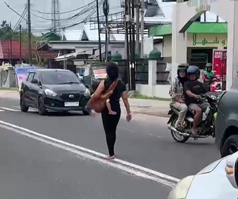 PALANGKA RAYA,katakata.co.id- Seorang wanita berpakaian serba hitam terlihat berjalan sambil menggendong anaknya, Minggu (5/4/2026) Siang di Jalan Seth Adhji. Adanya kejadian ini arus lalu lintas sedikit macet karena pengendara ingin melihat apa yang sedang terjadi.