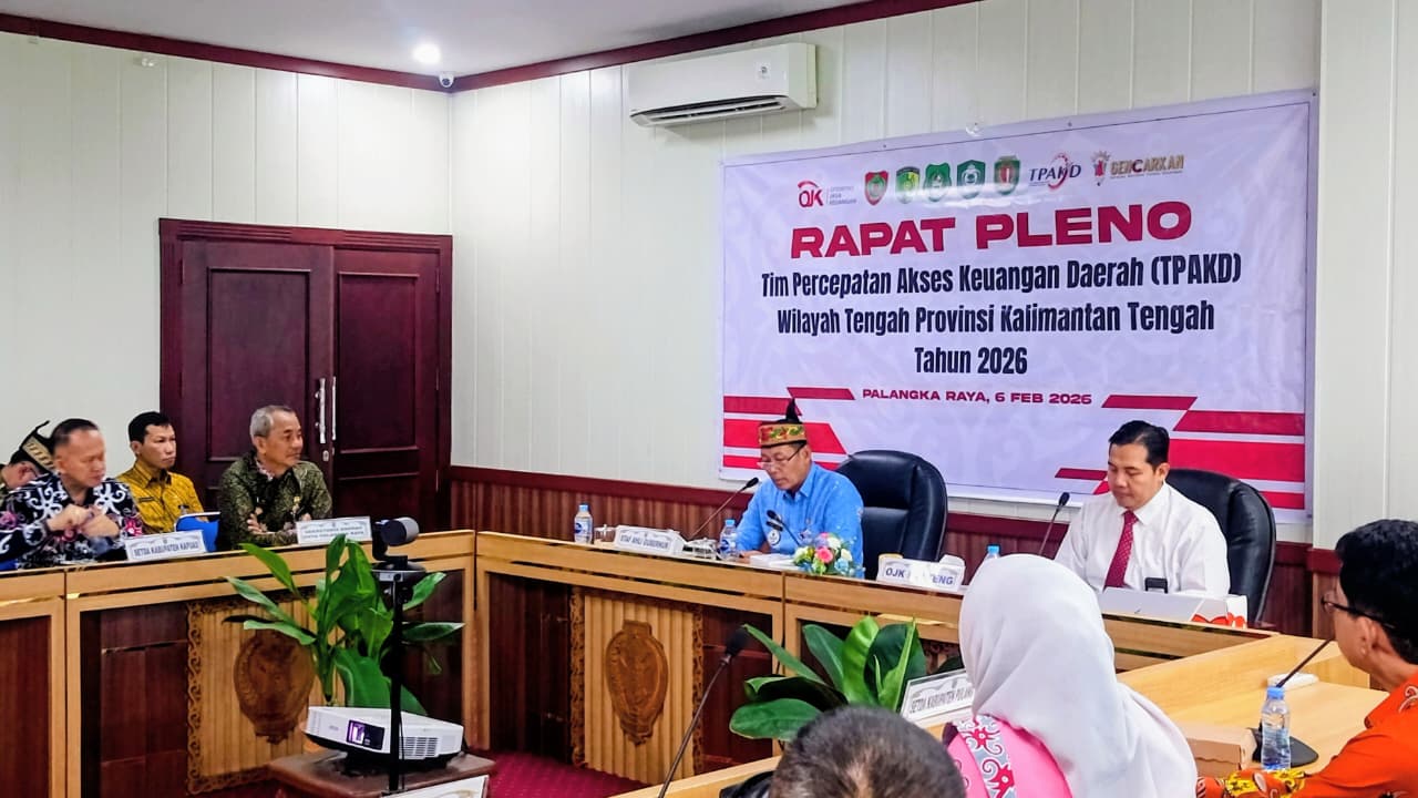 PALANGKA RAYA, katakata.co.id – Staf Ahli Gubernur Kalimantan Tengah Bidang Ekonomi, Keuangan, dan Pembangunan, Yuas Elko, mendorong optimalisasi akses pembiayaan bagi masyarakat dalam Rapat Pleno Tim Percepatan Akses Keuangan Daerah (TPAKD) Wilayah Tengah Tahun 2026 yang digelar di Ruang Rapat Bajakan Lantai II Kantor Gubernur Kalimantan Tengah, Jumat (06/02/2026).